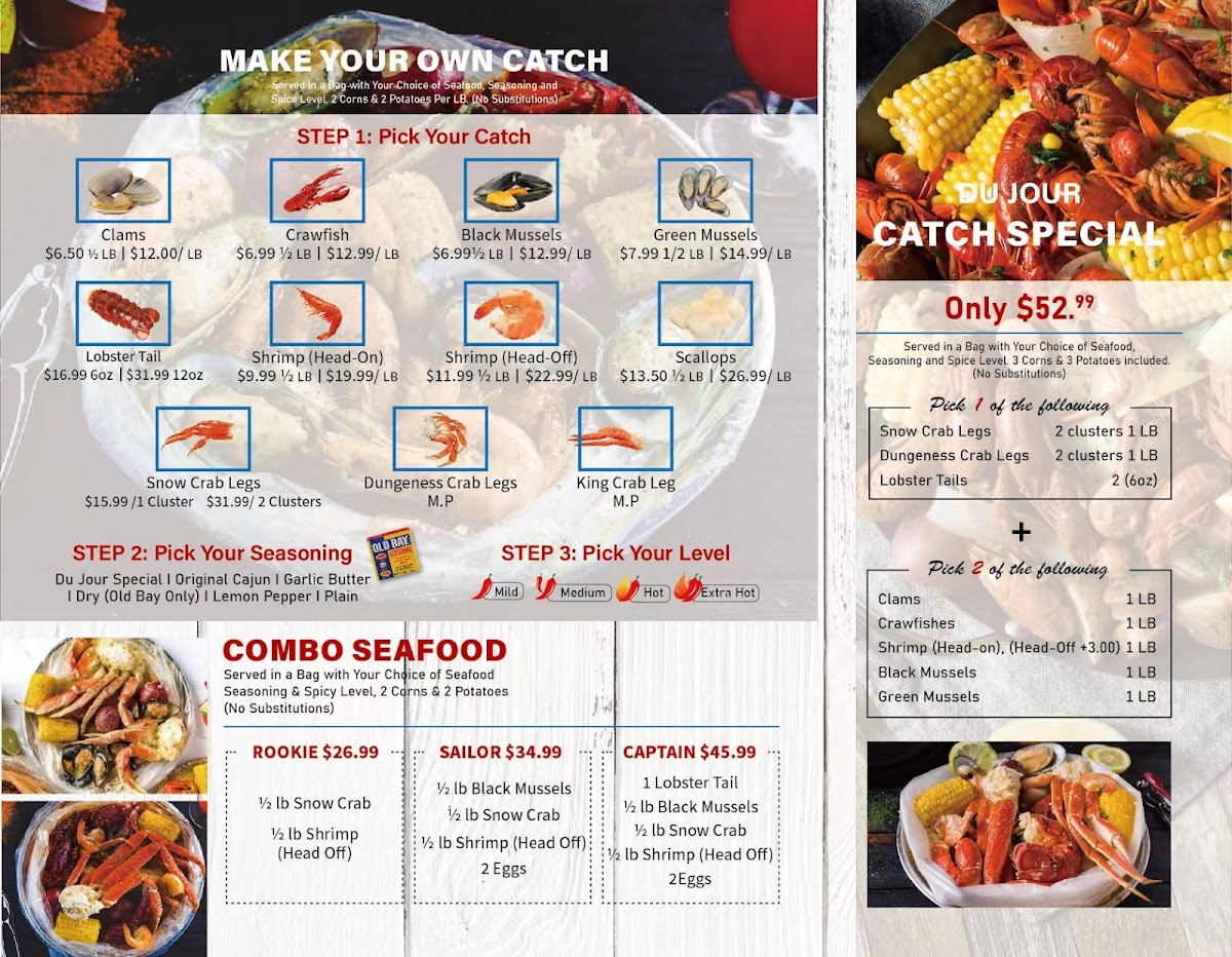 The sliders are a must-try, offering both fried chicken and flounder options served with crispy fries or onion rings. For those seeking a feast, the Combo Seafood selection is irresistible. The Captain's platter features a generous combination of lobster tail, snow crab legs, and shrimp, paired with boiled eggs and classic sides like corn and potatoes. With prices that cater to every budget, each dish promises a delightful experience. Come indulge your seafood cravings at Crab Du Jour Xpress!