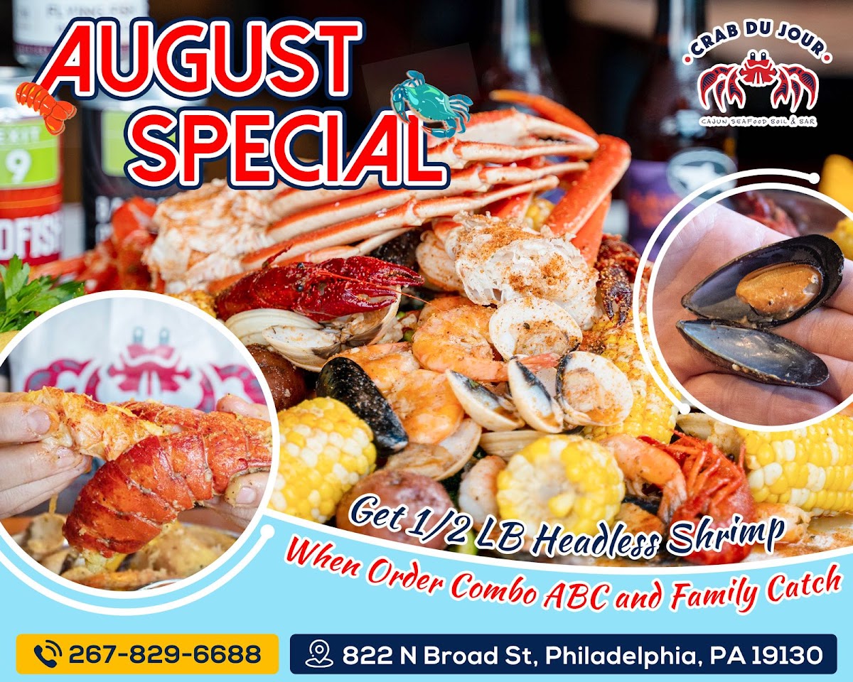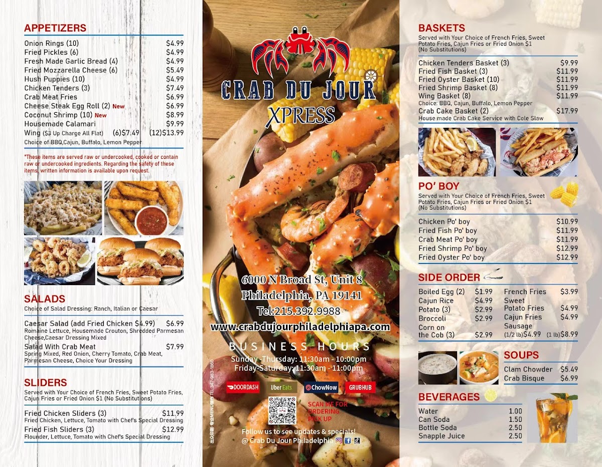 Welcome to Crab Du Jour Xpress Cajun Seafood, located at 6000 N Broad St #8 in Philadelphia, PA. This vibrant seafood restaurant brings a taste of Cajun flair to the heart of the city. The menu is a seafood lover's dream, featuring a variety of fresh options that highlight their specialties. Start with the refreshing Caesar Salad, or opt for a unique crab meat salad bursting with flavor.
